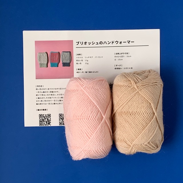 ==キットの販売です== ブリオッシュ編みのハンドウォーマーが作れるキットです。 編み図と毛糸が2色入っています。 ブリオッシュ編みは、通常のゴム編みよりも編み地が厚く、モチモチとしていて防寒性にすぐれています。 製作時間は、今度のお休みに編んで完成できるくらいです。 【キットに入っているもの】 ・リッチモアパーセント 2色 ・編み図 【ご用意いただくもの】 ・棒針5号(輪針でもOKです) ・はさみ ・とじ針 毛糸の色は A:サヴィル・ロウ(写真5枚目) B:草の花(写真6枚目) その他 からお選びいただけます。 サヴィル・ロウは、濃い灰色と、グレーがかった生成りが大人な印象の組み合わせです。 草の花は、薄いピンク色と薄いグリーンの、春先の草花のような可愛らしい印象の組み合わせです。 AまたはBの毛糸をご選択いただいた場合、ご注文より1〜2日で発送予定です。 その他の色のご希望がありましたら、購入オプション「色」から「その他」を選択し、ご希望をお知らせください。リッチモア・パーセントの色番号でお伝えいただけますと確実です。 お届け日数は5日程度になります。 ネコポス、クリックポストでは、毛糸を圧縮した状態でお届けいたします。
